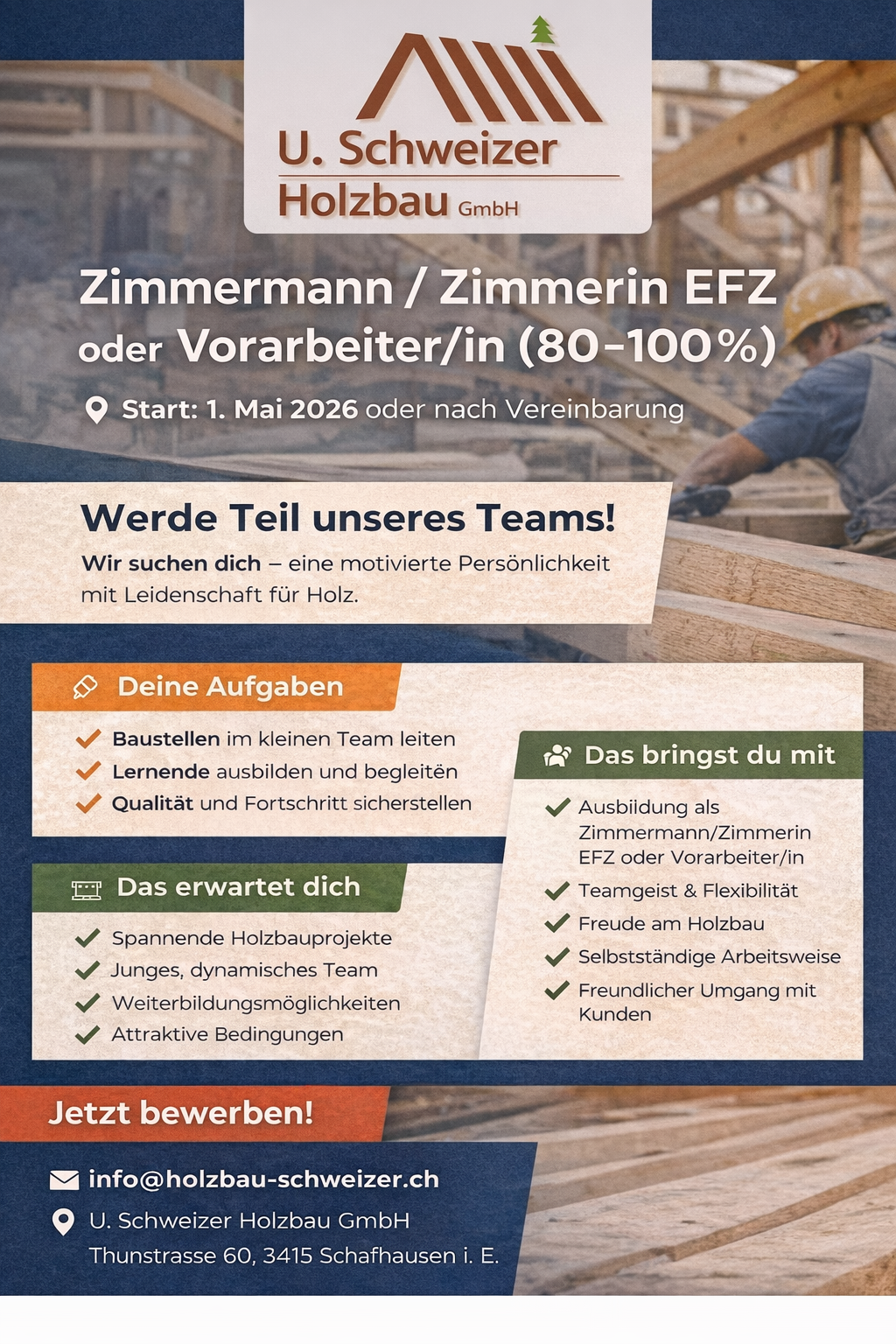 Per 1. Mai 2026 oder nach Vereinbarung suchen wir eine/n Zimmerin/Zimmermann oder Vorarbeiter/in